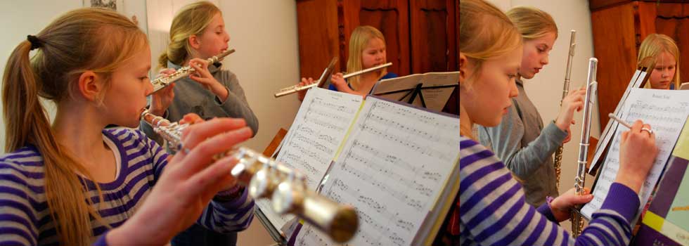 In het begin wordt veel tijd besteed aan het leren blazen op het kopstuk, de houding, toonvorming en ademhaling. In iedere les wordt, naast het fluitspelen, gewerkt aan de ritmische en melodische ontwikkeling.
